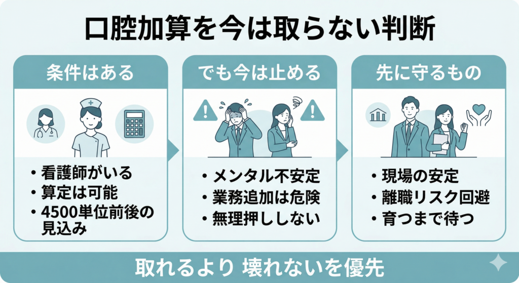 今のメンタル状態でこの口腔加算を入れても、たぶん質の良いものは提供できない。