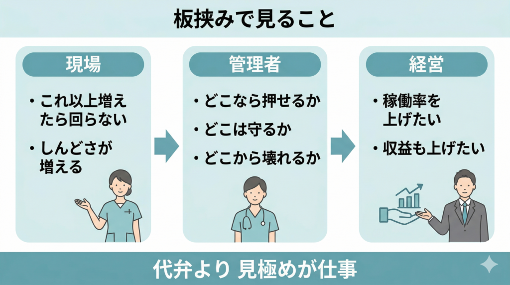板挟みの中で、何を先に見て、何を後に回すのか。