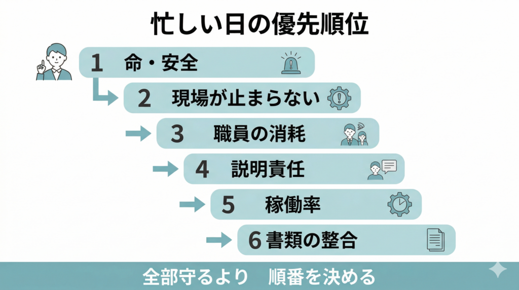 まとめ|管理者は「全部を守る人」ではなく「崩れない順番を決める人」になった